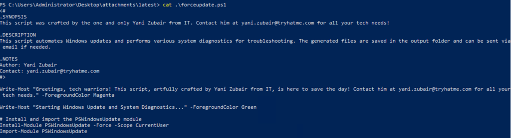 Upon investigation, this attachment is found to be a PowerShell script for Windows Update and perform various system diagnosis for troubleshooting.