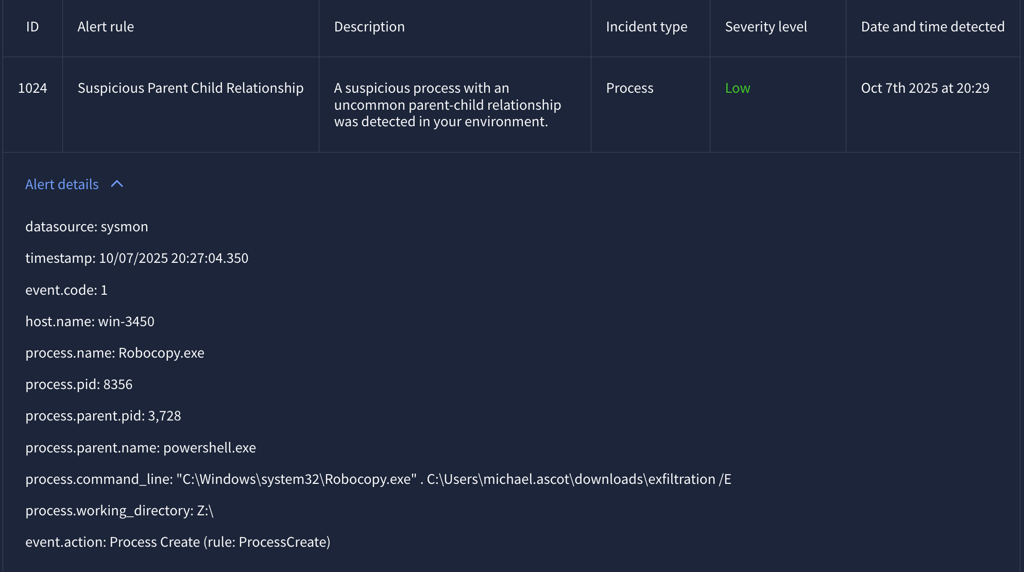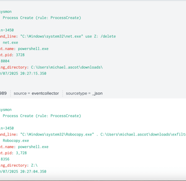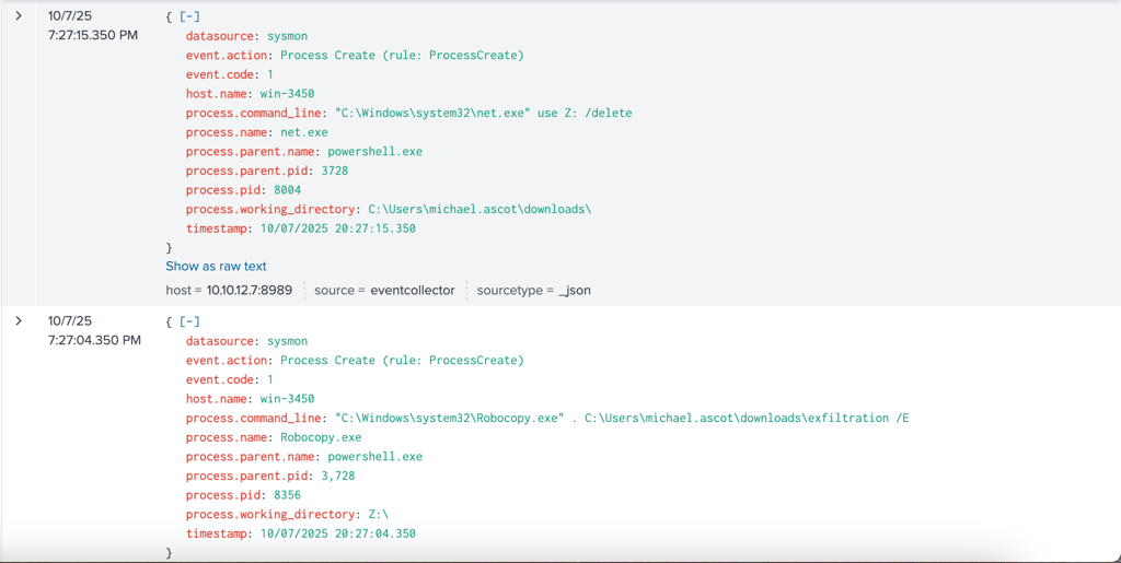 Once accessing to the file share, it initiated Robocopy.exe and transferred the shared directory to another location on the system, which is user’s Downloads directory, then compressed the files into a zip archive named exfil8me.zip.