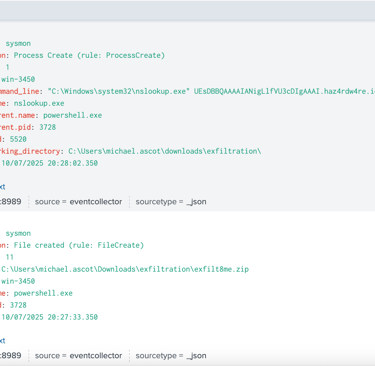 The PowerShell script reads the contents of the ZIP file exfilt8me.zip, encoded to base64 and then sends it out via a series of nslookup DNS requests to multiple malicious domains as haz4rdw4re.io.